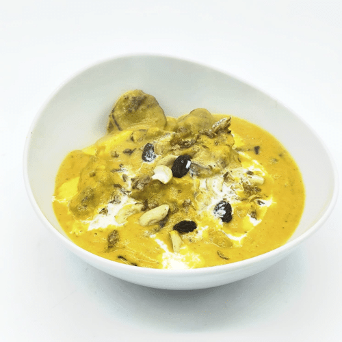 mit frischen Champignons, Rahmkäse, Rosinen, Mandeln, Cashewnüssen und Curry-Sahnesauce