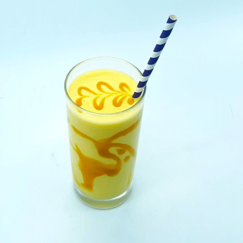 cremiger, hausgemachter mango lassi mit frischer mango und joghurt fruchtig, süß und erfrischend.